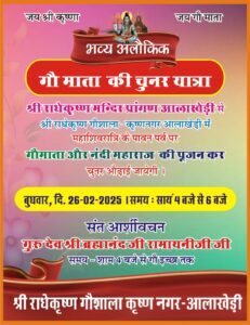 महाशिवरात्रि के पावन अवसर पर श्री राधेकृष्ण मंदिर आलाखेड़ी से श्री राधेकृष्ण गौशाला कृष्णनगर आलाखेड़ी तक एक भव्य आलौकिक गौ माता की चुनर यात्रा आयोजित की जाएगी। इस यात्रा में गौ माता और नंदी महाराज को श्रद्धा सुमन अर्पित करने के लिए श्रद्धालु लाल चुनर और सिर पर कलश लेकर शामिल होंगे। यह यात्रा महाशिवरात्रि की महिमा और गौ माता के प्रति भक्ति और सम्मान को प्रदर्शित करने का एक अद्भुत अवसर बनेगी। भक्तगण इस आयोजन में बढ़-चढ़कर भाग लेंगे और महाशिवरात्रि के दिन इसे खास और दिव्य बनाएंगे। यह भव्य आयोजन 26 फरवरी 2025 को शाम 4 बजे से 6 बजे तक होगा। Radhekrishna goshala chunar yatra